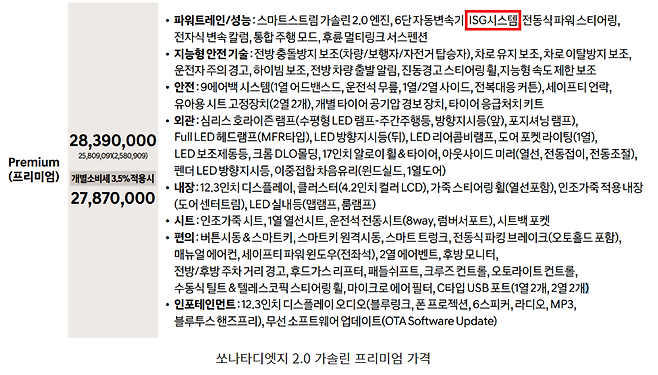 보통은 연료비가 저렴한 LPG를 추천드립니다만 오늘은 좀 다릅니다. LPG값의 고공행진이 계속되고 있고 원형 봄베라 예전보다는 트렁크 공간을 더 쓸 수 있기는 하지만 LPG(360리터), 가솔린(480리터)로 확실히 가솔린이 더 유리합니다. 그리고 결정적인 차이가 하나 있으니 바로 ISG 유무입니다.