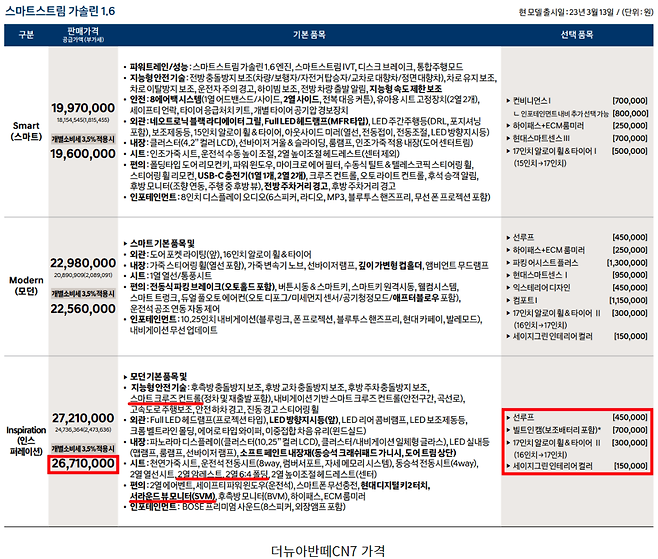 음.. 그런데 저는 이렇게 구성을 하시려고 고민하는 분들에게는 솔직히 아반떼에서 다 때려넣고 타시라고 말씀 드리고 싶습니다. 더뉴아반떼CN7의 경우 최고등급에서 선루프, 빌트인캠, 17인치 휠, 세이즈 인테리어까지 정말 넣을 수 있는 걸 다 넣었을 때 2,831만원이기 때문입니다.