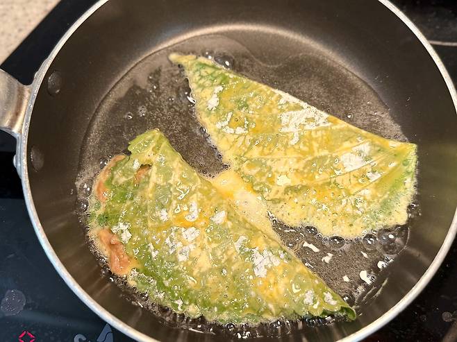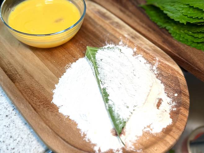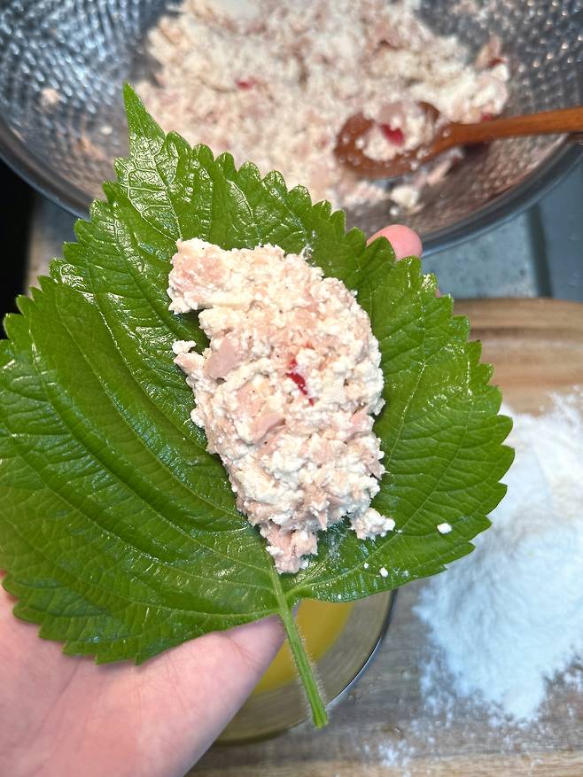 4️⃣ 깻잎 1장을 들고 반쪽에만 소를 넣어주시고요. 접은 상태에서 부침가루를 앞/뒷면 묻혀주고, 계란물까지 묻혀주세요. 그리고 기름 두른 프라이팬에 넣어 부쳐주시면 완성입니다.