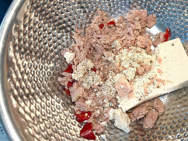 2️⃣ 깻잎전에 들어가는 소 준비할게요. 기름 쫙 뺀 참치 통조림 1캔과 물기 쫙 뺀 두부 1/2모를 준비하세요. 홍고추도 1/2개만 썰어넣었어요. 후추는 5번만 두들겨줍니다.
