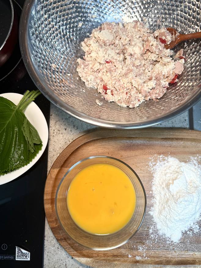 🥬 재료 : 참치캔(100g) 1, 두부 1/2모, 홍고추 1/2개, 깻잎 14장, 부침가루, 달걀 2알, 후추 5번