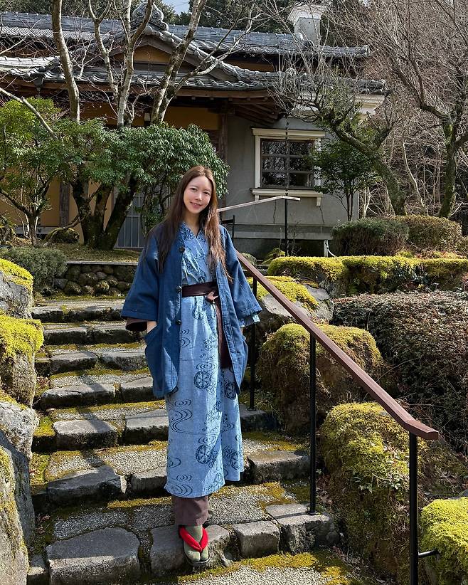 기모노를 착용한 박현선은 전통적인 일본 의상을 현대적으로 소화했다. 푸른색 기모노와 데님 재킷을 레이어드하여 독특한 스타일링을 선보였으며, 빨간색 게다(일본 전통 신발)는 포인트 아이템으로 활용되었다. 자연 속에서 촬영된 이 룩은 전통과 자연의 조화를 잘 보여준다.
