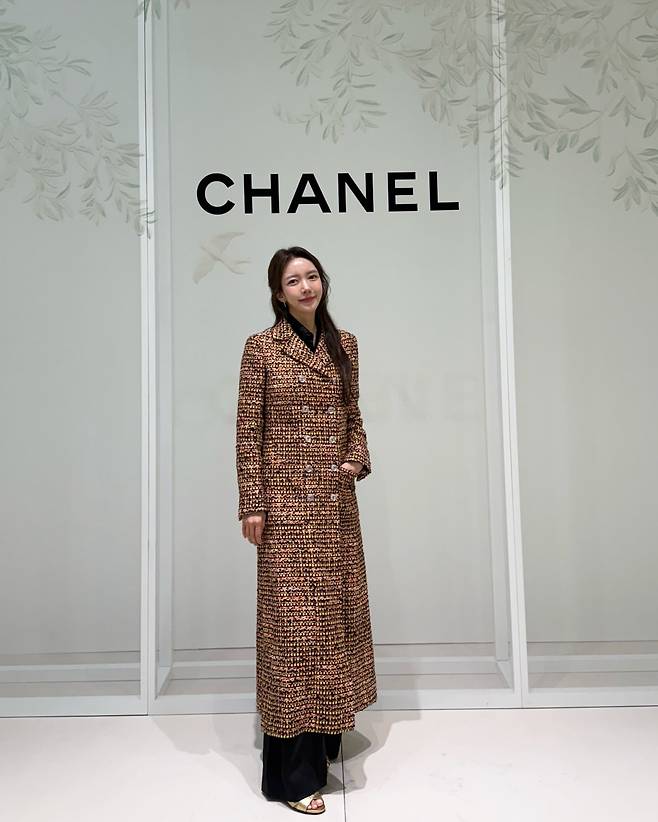 샤넬 브랜드 앞에서 포즈를 취한 박현선은 트위드 롱 코트를 착용해 고급스러운 이미지를 강조했다. 코트 안에 블랙 이너를 매치해 단정하면서도 세련된 분위기를 연출했으며, 하단의 와이드 팬츠와 골드 샌들은 우아함을 더한다. 브랜드 이미지와 완벽히 어우러지는 품격 있는 스타일이다.