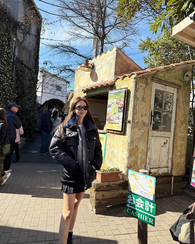 박현선은 블랙 패딩 재킷과 짧은 스커트를 매치해 겨울철에도 세련된 미니멀 룩을 선보였다. 패딩의 실용성과 스커트의 경쾌함이 조화를 이루며, 블랙 워커가 강렬한 느낌을 더한다. 배경의 소박한 건물과 대비되는 시크한 스타일이 눈길을 끈다.