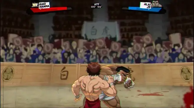 '한마 바키: 블러드 아레나'는 격투 게임이라지만, 오늘날 격투 게임들이 주로 쓰는 사이드 뷰 방식은 아니다. 그보다는 과거 패미컴, 슈퍼패미컴 시절에 쓰이곤 했던 숄더뷰 방식인 게 특징이다. 이 방면에서는 전설, 아니 레전드급인 '슈퍼 펀치 아웃!!'과 유사하다고 할 수 있다. 이에 따라 게임 플레이 역시 각종 커맨드를 기반으로 한 최근 격투 게임과 달리 여러모로 심플하다. 상대가 상하좌우 어느 방향에서 공격할지를 보고 타이밍을 맞추는 방식이다.