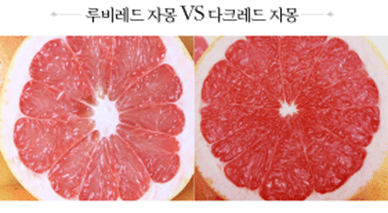 시중에 나와 있는 자몽은 크게 세 종류로 옅은 붉은 빛을 띠는 과육이 특징인 루비레드 종과 짙은 붉은 빛의 과육을 가진 다크루비 종, 그리고 껍질이 덜 익은 것처럼 푸른 빛깔을 띠는 메로골드 종이 있다. 루비레드는 한국인이 가장 선호하는 품종으로 씨가 거의 없으며 엷은 붉은 빛을 띤 과육에 노란 계열의 껍질을 가진 자몽으로 미국 플로리다와 캘리포니아에서 주로 수입되고 있으며, 11월부터 이듬해 4월까지는 미국 플로리다에서 5월부터 11월까지는 캘리포니아에서 수입되고 있다.