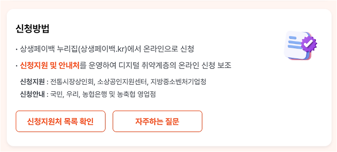본 게시물은 정보 제공을 위한 콘텐츠로, 신청 자격 및 조건은 정책 변경에 따라 달라질 수 있습니다. 반드시 상생페이백 공식 홈페이지를 통해 최신 내용을 확인하시기 바랍니다. 본 블로그는 해당 정책의 공식 운영기관이 아니며, 정보 제공 목적 외의 어떤 법적 책임도 지지 않습니다.