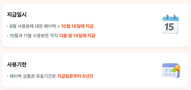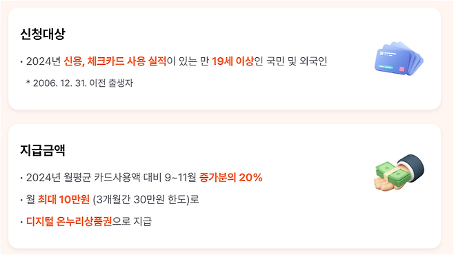 ▪️3개월 동안 최대 30만원까지 디지털 온누리상품권 형태로 제공되며, 지급일은 사용월 다음 달 15일입니다. (예: 9월 사용 → 10월 15일 지급)