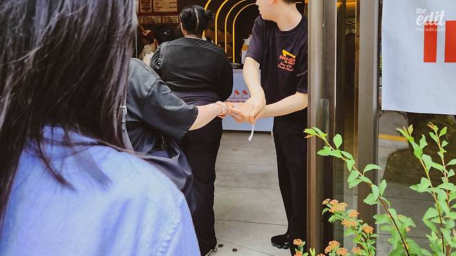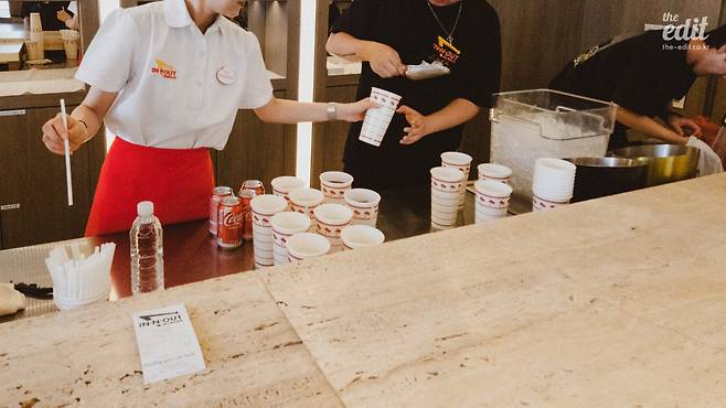 한편으로는 놀랐고, 다른 한편으로는 절망했다. “아무래도 취재를 포기해야겠어요.” 에디터H에게 이렇게 말하려고 했다. 오늘 할 일이 많은데 언제까지 줄만 서 있을 수는 없는 노릇이니까. 고민하는 사이 직원은 다가와 인앤아웃 로고가 프린트된 팔찌를 하나씩 채워주었다.
