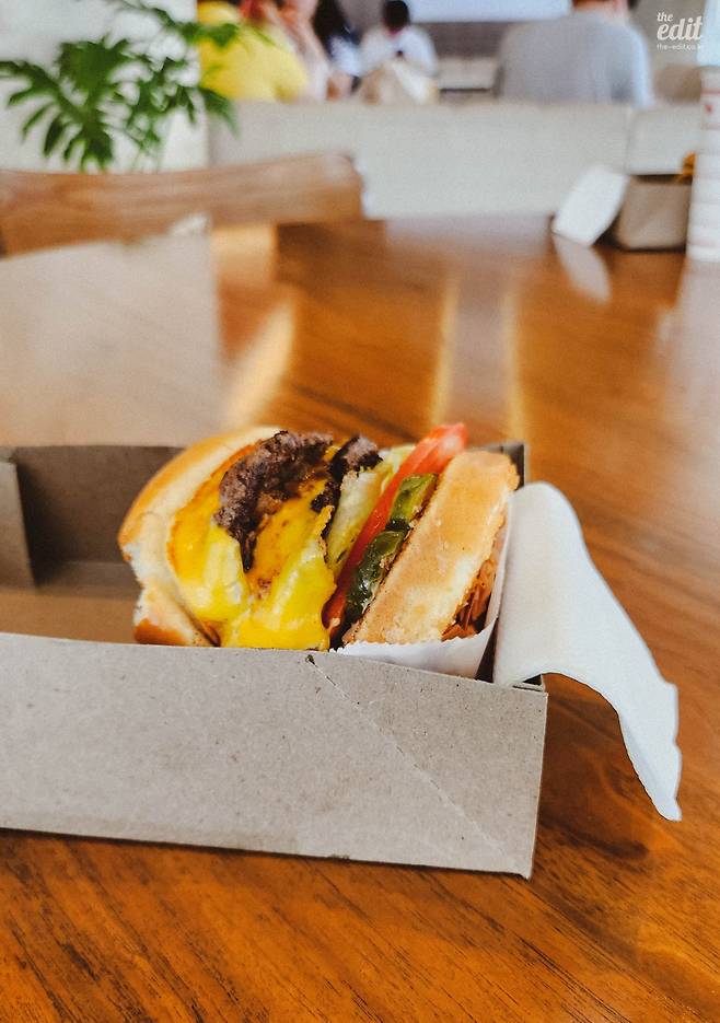 일단 번부터 뜯어 먹어봤다. 건조한 느낌의 번이었다. 참깨가 많이 올라갔다거나 버터 향이 난다거나 빵만 뜯어 먹어도 맛있다거나 하는 번이 아니었다. 의외였고, 기대와는 달랐다. ‘재료가 주는 맛을 최대한 살리기 위해서 번은 오히려 평범한 걸 쓴 걸까?’ 이런 생각을 하며 한 입 크게 베어 물었다.