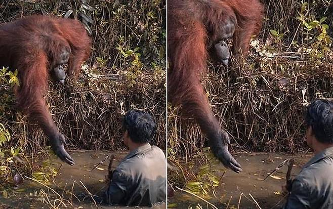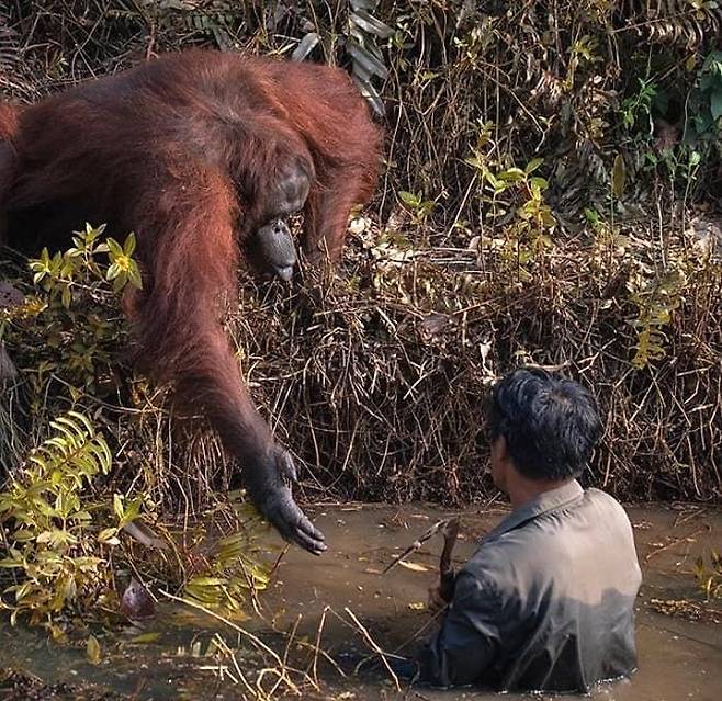 진흙투성이 물속에 빠진 탓에 곤경에 처한 사람을 보고 외면하지 않고 손을 내밀어 도와주려고 하는 오랑우탄이 있는 것 아니겠습니까.