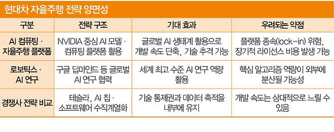 둘째, 자율주행 수직계열화(Vertical Integration)를 일군 테슬라에 비춰 현대차 전략의 양면성을 우려하는 시각도 있다. 테슬라는 ▲차량용 AI 반도체(FSD 칩) ▲자율주행 알고리즘 ▲데이터 학습 체계 ▲소프트웨어 업데이트까지 대부분을 자체 개발하는 수직계열화 구조다. 차량에서 수집되는 방대한 주행 데이터를 자체 AI 인프라에서 학습시키고 이를 다시 차량 소프트웨어에 반영한다. 이런 전략은 기술 개발 속도는 상대적으로 느릴 수 있지만, 장기적으로는 핵심 알고리즘과 데이터, 플랫폼 통제권을 모두 내재화할 수 있다는 장점이 있다.