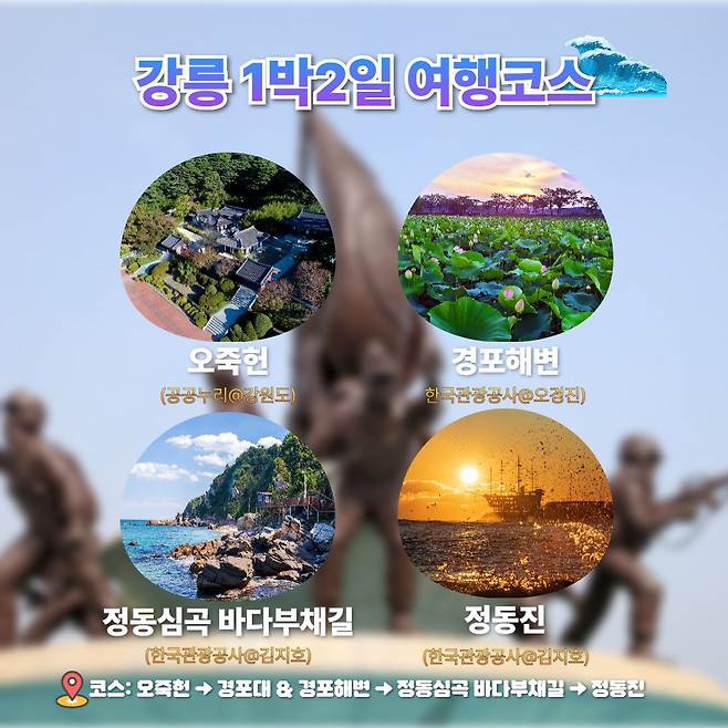 ※코스: 오죽헌 → 경포대 & 경포해변 → 정동심곡 바다부채길 → 정동진