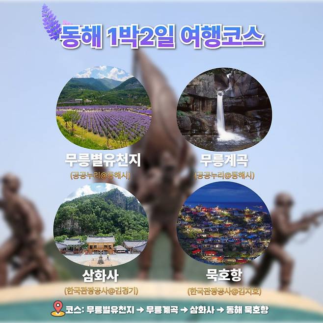 최근 SNS에서 주목받고 있는 인기 강원도 여행지. 동해입니다. 서울에서 멀지 않아 동해 1박2일 여행코스로도 상당히 제격이죠. 먼저 6월 중순에 보랏빛 물결로 장관을 이루는 무릉별유천지에서 라벤더 향을 맡고 가세요.(축제는 6월 14일부터지만 그 전에 방문해도 멋진 풍경 기대 가능)