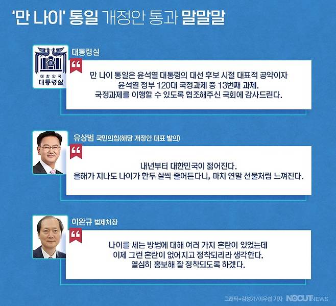 이 개정안을 대표 발의한 국민의힘 유상범 의원도 법안 통과 후 자신의 페이스북에 "내년부터 대한민국이 젊어진다. 올해가 지나도 나이가 한두 살씩 줄어든다니, 마치 연말 선물처럼 느껴진다"고 기뻐했습니다.