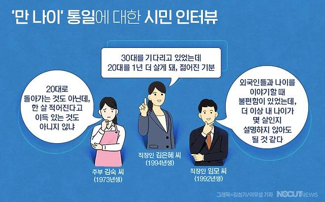 실제로 1994년생 직장인 김은혜 씨는 CBS노컷뉴스와의 인터뷰에서 "30대를 기다리고 있었는데 20대로 1년 더 살게 돼, 젊어진 기분"이라며 '체감 나이 하향'에 기대감을 숨기지 못했습니다.