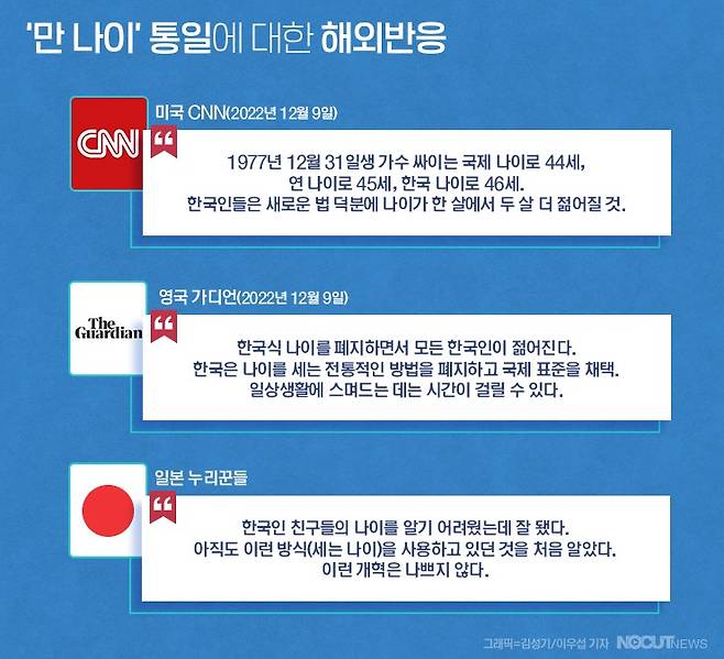 영국 매체 가디언도 같은 날 '한국식 나이를 폐지하면서 모든 한국인이 젊어진다'는 제하의 기사를 통해 "한국은 나이를 세는 전통적인 방법을 폐지하고 국제 표준을 채택하는데, 이는 공식 문서에서 사람들의 나이를 1~2살 줄일 것이지만 일상생활에 스며드는 데는 시간이 걸릴 수 있다"고 알렸습니다.
