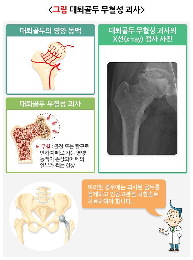 대퇴골두는 골반뼈와 맞닿는 둥근 뼈머리입니다. 이곳은 몇 가닥의 가는 혈관에만 의존해 영양을 공급받는데, 혈관이 좁고 약하다 보니 막히면 우회할 길조차 없습니다. 러닝이나 축구 같은 격한 운동을 반복하면 고관절에 체중의 몇 배에 달하는 하중이 실리고, 착지 불균형이나 자세 문제로 혈관에 염증이나 손상이 생기기 쉽습니다. 여기에 과음, 스테로이드 남용 같은 요인까지 겹치면 혈류가 막히면서 결국 뼈 괴사가 진행되는 것이죠.