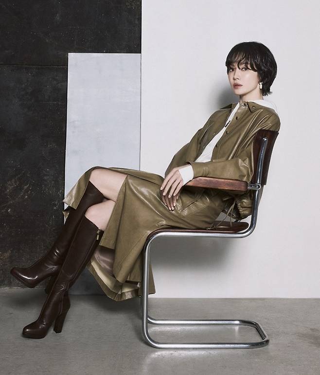 가을의 시크한 멋을 느낄 수 있는 카키 베이지 컬러의 레더 착장에는 하이 부츠를 매치해 실용적이면서도 감각적인 도회적 무드를 연출했다.