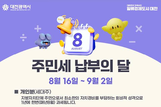 7월 1일을 기준으로 대전시에 주소를 둔 세대주가 개인분 납부 대상이며, 납부 기한은 오는 9월 2일까지다. 다만 세대주의 직계비속으로 단독 세대를 구성하는 30세 미만이면서 미혼인 사람, 미성년자, 국민기초생활 수급자 등은 납세 의무에서 제외된다.