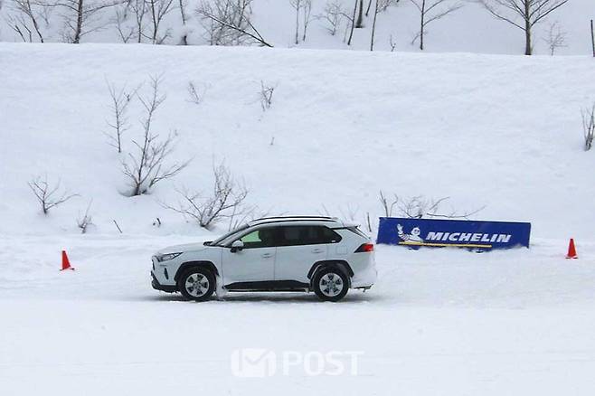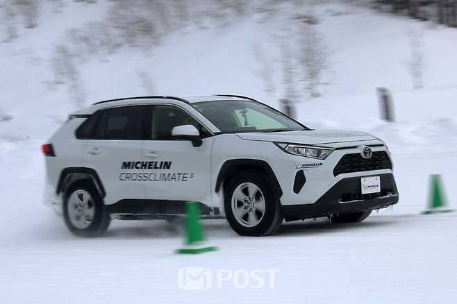첫 번째 테스트는 횡경사, 슬라럼, 급정거(빙판 30㎞/h, 눈길 50㎞/h), 차로변경을 종합적으로 구현한 코스에서 이뤄졌다. 테스트카는 토요타의 베스트셀링 SUV인 RAV4가 준비됐고, 크로스클라이밋 3와 비교할 타이어는 젖은 노면과 눈길에서의 접지력, 제어 성능을 강조한 국내 H 사의 A 제품이 선정됐다.