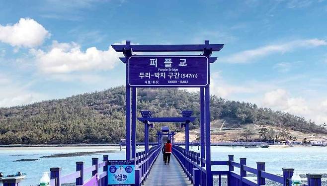 전남 신안군 안좌면에 위치한 '퍼플교'는 섬으로 향하는 길 자체가 여행의 목적이 되는 곳이다. 이 다리는 박지마을에서 평생을 살아온 한 할머니의 소망에서 시작됐다. 살아생전 박지도에서 목포까지 두 발로 걸어가고 싶다는 바람이 계기가 되어, 2007년 신활력 사업을 통해 목교가 조성됐다.