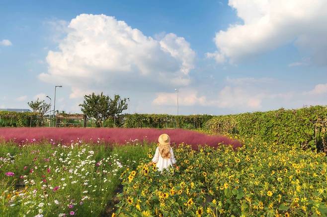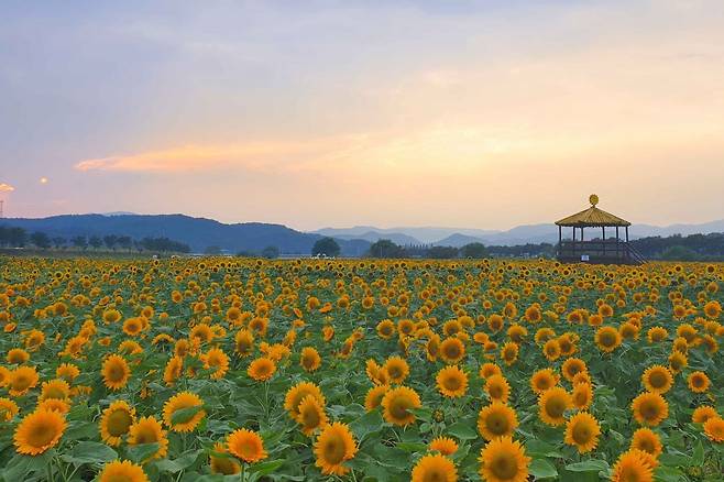 넓게 펼쳐진 해바라기밭과 함께 산책로가 잘 정비되어 있어 가족이나 연인과 함께 걷기에도 좋고, 귀여운 오두막이 포인트입니다.