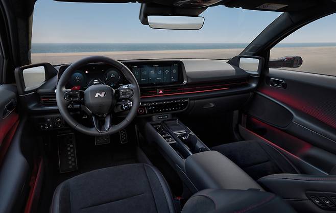 실내에도 N 라인 전용 3 스포크 스티어링 휠과 메탈 페달 및 풋레스트 등을 통해 스포티한 느낌을 극대화했다.