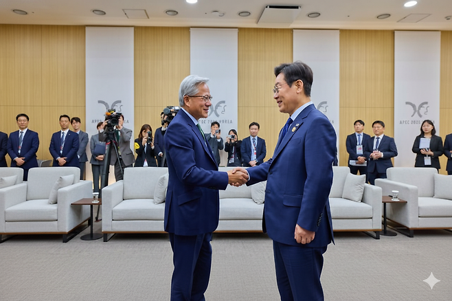 엔비디아의 CEO, 젠슨 황은 직접 한국을 찾았습니다. 경주에서 열린 APEC 회의 자리에서 이재명 대통령, 이재용 회장, 최태원 회장, 이해진 의장과 함께 'AI 협력'이라는 이름의 초대형 딜을 발표했습니다.