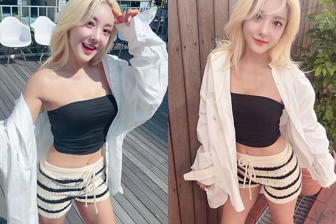 또 블랙 튜브톱에 스트라이프 니트 쇼츠, 그리고 루즈핏 화이트 셔츠를 걸쳐 경쾌하고 편안한 여름 캐주얼 스타일을 연출하며 슬림한 몸매를 뽐냈다.