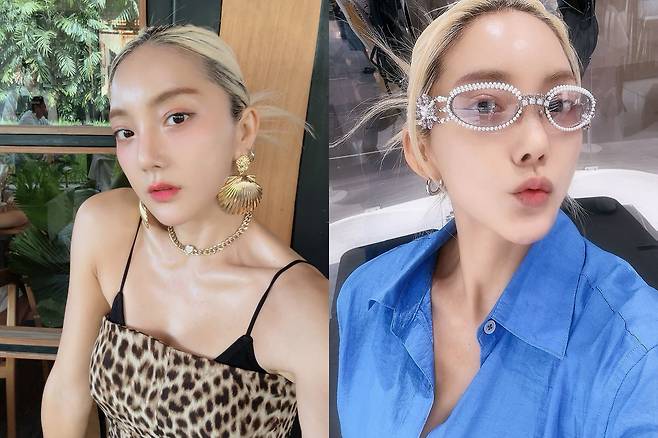 바다는 레오퍼드 패턴의 슬립 원피스에 블랙 이너를 매치하고, 볼드한 골드 조개 모양 귀걸이와 체인 목걸이로 포인트를 줬다. 또 다른 사진에서는 블루 셔츠에 크리스털 장식 선글라스를 착용해 이국적이면서도 개성 넘치는 무드를 완성했다.