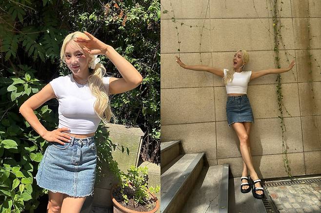 바다는 화이트 크롭 티셔츠에 데님 미니 스커트를 매치해 심플하면서도 청량감 있는 데일리룩을 보여줬다. 여기에 블랙 스트랩 샌들로 실용성과 시원함을 더했다.