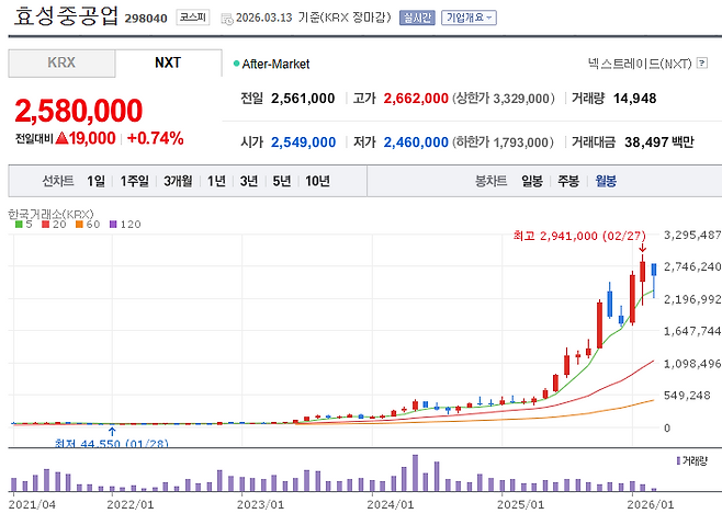 52주 저점은 382,000원이었다. 오늘(3/13) 종가는 2,580,000원. 저점에서 6.8배 오른 자리다.