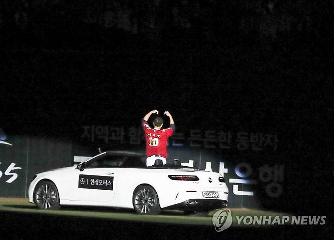 (부산=연합뉴스) 강덕철 기자 = 8일 부산 사직야구장에서 열린 롯데 자이언츠 영원한 4번 타자 이대호 'RE:DAEHO' 은퇴식에서 이대호가 그라운드를 돌며 팬들에게 인사하고 있다. 2022.10.8