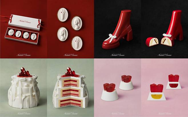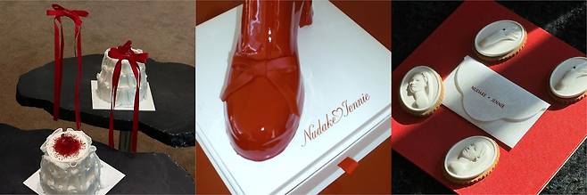 이번 협업은 제니의 첫 솔로 정규 앨범을 기념하며 제작되었는데요. 누데이크의 기발한 상상력과 제니의 아이덴티티와 미감을 함축해 완성한 결과물이죠. 총 케이크 2종류, 쿠키 1종류, 판나코타 1종으로 구성되어 있습니다. 먼저, 구두 모양의 골드럼 수플레 케이크 ‘루즈 힐(Rouge Heel)’은 강렬한 형태처럼 진한 헤이즐넛 초콜릿 레이어링으로 구성되어 있습니다. 제니가 셀카 속 들고 있던 케이크도 무척 궁금하죠, 이름도 제니의 본명을 딴 ‘제니루비제인(Jennierubyjane’이라는 사실! 제니를 상징하는 리본을 장식한 3단 케이크로 장미 향과 베리 크림이 어우러져 우아한 디자인처럼 우아한 풍미를 내죠. 제니의 초상을 화이트초콜릿으로 새긴 쿠키는 ‘카메오(Cameo)’로 이번 협업 중 누데이크의 감성을 가장 잘 나타내는 디저트가 아닐까 싶네요. 마지막으로 빨간 꽃송이를 심어둔 듯한 판나코타 ‘코타(Cotta)’는 상큼한 베리 초콜렛 셸, 파인애플과 코코넛 두 가지 맛으로 즐길 수 있죠. 우리의 눈도 입도 즐겁게 해줄 ‘Nudake♡Jennie’의 팝업과 디저트는 오는 28일 하우스 도산에서 진행될 예정이라는 점! 체크해둬야겠죠?