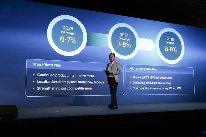 한편, 현대차는 연결 부문 영업이익률 목표를 ▲2025년 6~7% ▲2027년 7~8% ▲2030년 8~9%로 설정했다. 하이브리드 및 제네시스 중심 판매 믹스 개선, 지속적인 현지 생산 및 소싱 최적화 등 현지화 전략, 하이브리드 및 EV, SDV 원가 경쟁력 강화 등으로 지속적으로 수익성 개선을 추진한다는 계획이다.