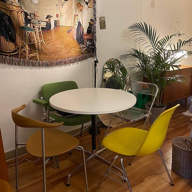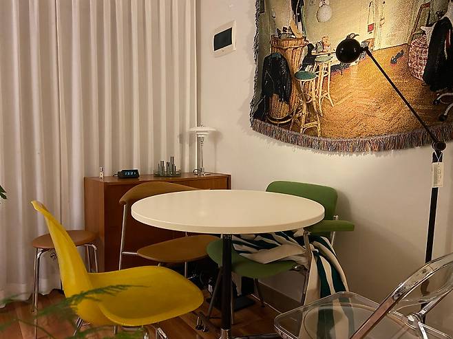 다이닝 공간처럼 쓰고 있는 거실 공간부터 보여드리겠습니다. 이곳의 큰 주제는 '금속의 차가움'입니다. 방의 바닥과 빈티지 가구들의 색이 여름이면 다소 더워 보여 바닥과 직접 닿는 테이블과 의자를 모두 금속 소재가 사용된 제품들로 선택했습니다.