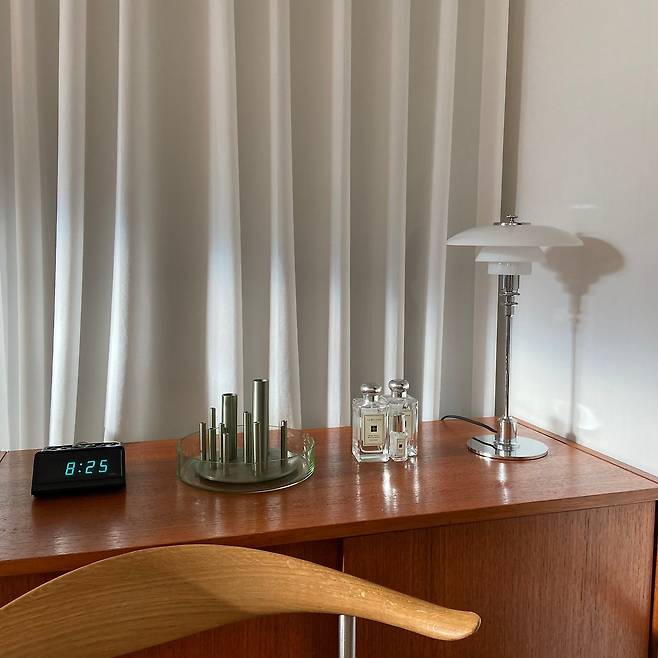 테이블 앞 사이드 보드장은 거실 컨셉을 대표하는 공간입니다. 사이드보드장 위의 오브제들로 수직의 선, 시간의 흐름, 후각 그리고 금속의 차가움을 표현하고 싶었습니다.