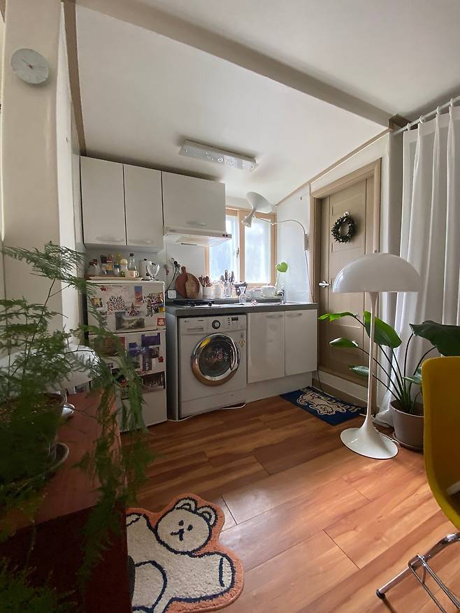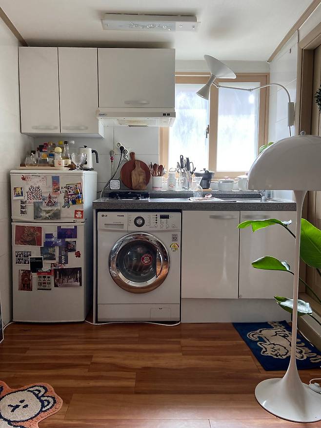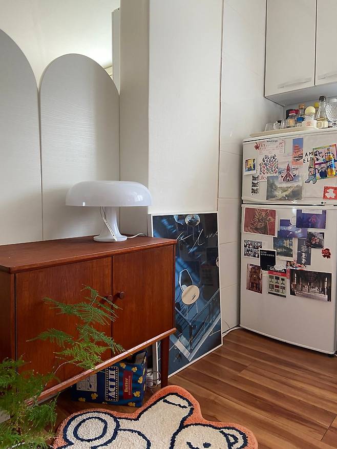 포인트가 있다면 냉장고에 붙여둔 엽서와 스티커입니다. 전기효율 스티커가 보기 싫어서 최대한 가려보려고 했습니다.