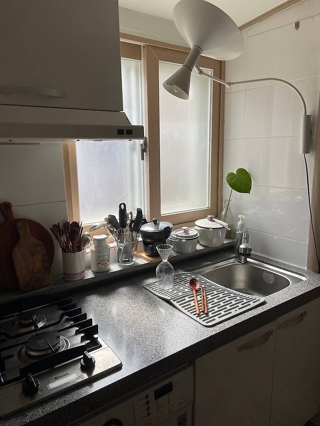 주방은 아무래도 생활감이 느껴지는 물건이 많아 최대한 정리된 모습을 유지하는 데 초점을 두었습니다. 대신 부착형 고리를 이용해 벽에 조명을 설치해 실용성을 더했습니다.