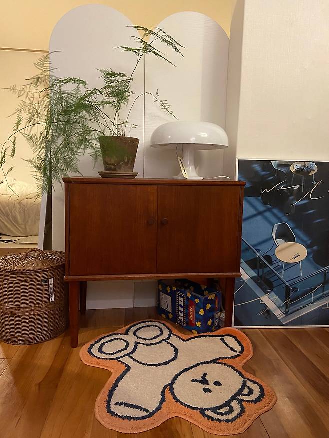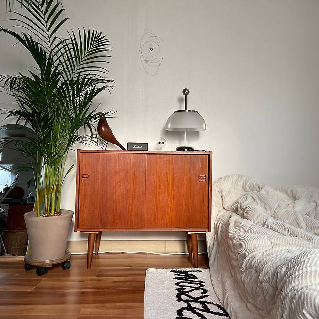 처음 방을 꾸밀 때는 실패가 적은 화이트로 시작해서, 가급적 어두운 컬러를 사용하지 않으려고 했습니다. 하지만 이 빈티지 가구를 구입한 이후로 하얀색을 고집하기보다는 더욱 다양한 색을 활용하려고 한 것 같습니다. 이 공간을 시작으로 방 꾸미기 컨셉이 많이 바뀌게 되어 여러모로 의미가 있는 곳입니다.