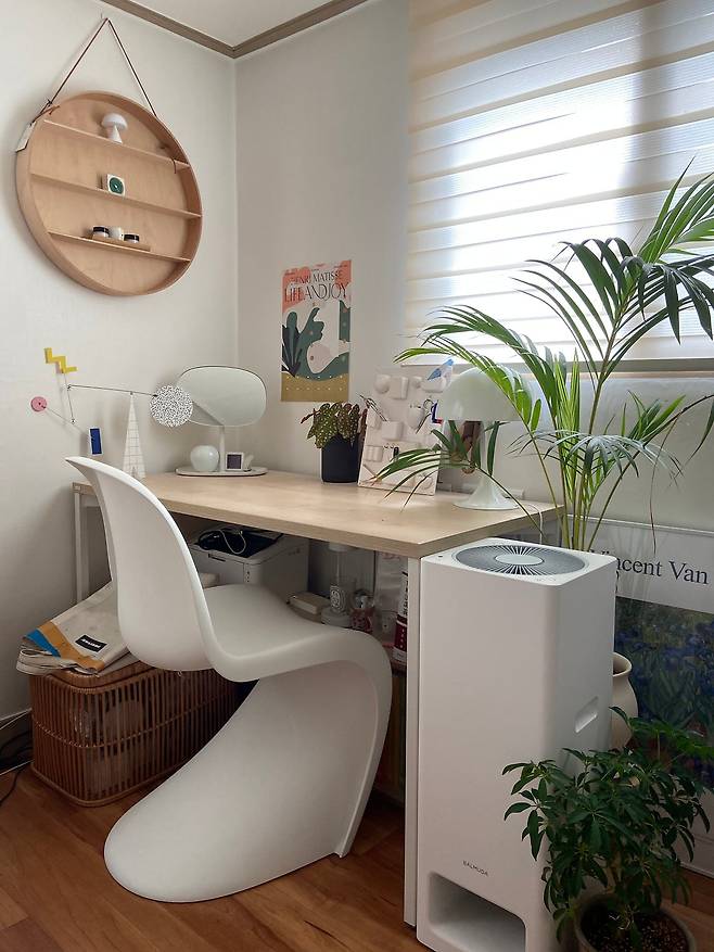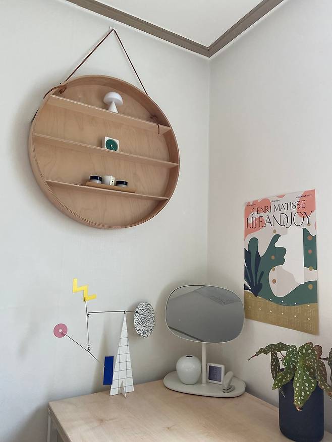 책상 위에는 아침 햇살이 제일 먼저 들어오는 장소라 식물을 기르기에도 좋아서 여러 작은 식물을 올려두었습니다. 그 옆의 거울은 아래엔 수납공간이 있고, 360도 회전시켜 쓸 수 있어서 추천드립니다.