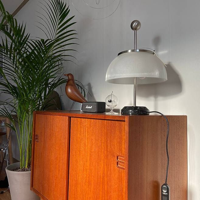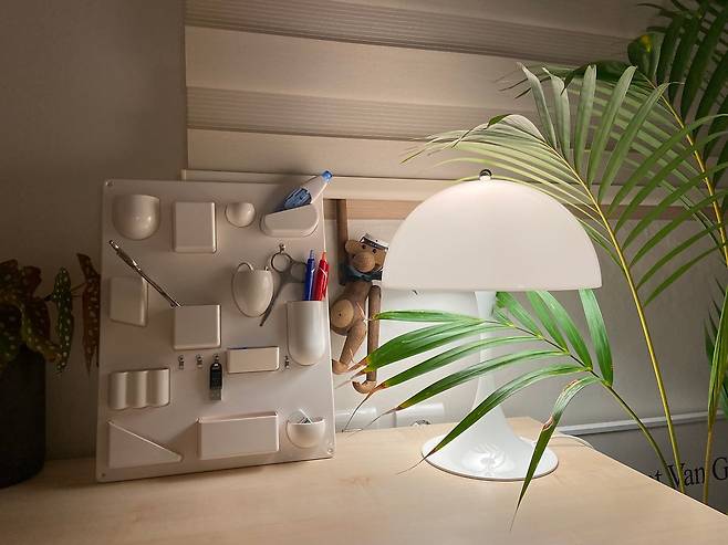 책상 위 스토리지 보드에는 손톱깎이, USB처럼 주기적으로 쓰지만 막상 사용하려면 찾기 힘든 제품들을 수납해두었습니다. 사진에서 보이는 것처럼 조명을 하나 올려두었는데, 제가 처음으로 구입했던 디자이너 조명입니다. 이 제품을 통해 조명에 빠지게 되었다고 할 수 있는데요. 둥근 쉐이드를 통해 펼쳐지는 빛이 정말 부드러운데 사진에서는 제대로 담기지 않아서 아쉽습니다.
