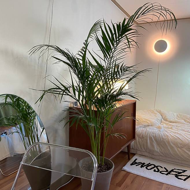 다음으로 보여드릴 공간은 컨셉 공간입니다. 나무의 결이 살아 있는 원목 가구와 오브제, 빛을 부드럽게 만들어 주는 조명, 빛을 움직임으로 표현하는 오브제 그리고 시원하게 뻗은 야자가 놓여 있는 모습은 제 방 인테리어가 가진 방향성을 보여주는 것 같아 친구들에게 방을 소개할 때도 가장 먼저 보여주는 모습입니다.