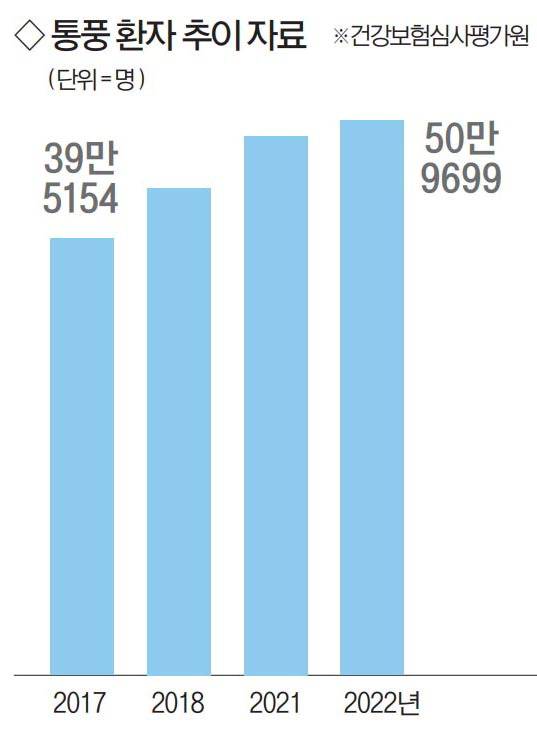 통풍은 바람만 스쳐도 고통스러울 만큼 통증이 심해 ‘질병의 왕’이라고도 불린다. 이는 혈액 내 요산의 농도가 높아지면서 발생하는 요산염 결정이 관절의 연골, 힘줄 등 조직에 침착되는 질환이다. 요산염 결정은 바늘처럼 뾰족한 모양이기 때문에 극심한 통증을 일으킨다. 만성 전신 대사 질환이다. 건강보험심사평가원에 따르면 2017년 39만5154명이던 통풍 환자는 2021년 49만2373명으로 매년 꾸준히 증가하고 있다. 전 세계적으로도 증가 추세다.