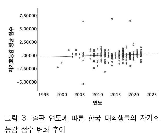 위 논문에서는 시교차적 메타분석(cross-temporal meta-analysis)이라는 기법이 쓰였다. 학술적인 이야기는 차치하고 간단하게 말하면, 정해진 기간(본 논문에서는 1999-2022) 동안 ‘자기효능감’이 측정된 논문들을 싸그리 모아서, 자기효능감 점수가 연도에 따라 어떻게 변화했는지를 알아봤다고 이해하면 된다.