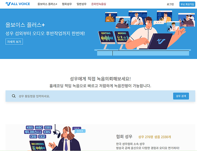 올보이스는 성우 녹음에만 집중하는 플랫폼입니다. 주로 구인 글이 올라오면 성우가 그에 맞춰서 오디션을 보는 형태로 계약이 이루어지고 있습니다. 방송국 출신 협회 성우, 비공채 성우를 다 가리지 않고 다 같이 경쟁하는 구도입니다. 그렇지만 협회 성우가 참여할 수 있을 만큼 페이가 센 편이에요.