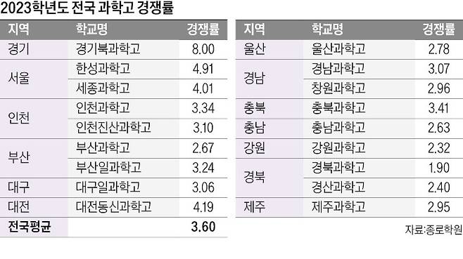 5일 교육계에 따르면 2023학년도 전국 20개 과학고 중 입학 경쟁률이 가장 높은 곳은 경기북과학고였다. 경기도의 유일한 과학고인 경기북과학고의 경쟁률은 8 대 1로 전국 평균(3.6 대 1)보다 두 배 이상으로 높았다. 경쟁률이 가장 낮은 경북과학고(1.9 대 1)에 비하면 네 배가 넘는다.