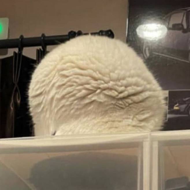 고양이가 몸을 공처럼 동그랗게 말아서 캐비닛 위에 올라가 있었는데 하필 털 색깔이 바닐라 색깔과 비슷해서 진짜 바닐라 아이스크림으로 착각하게 만든 것인데요.