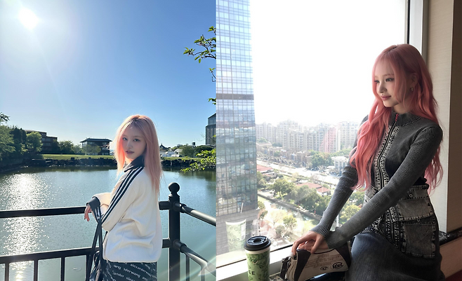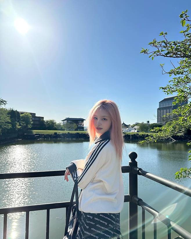 물가에서 포착된 리즈는 화이트 니트 가디건과 알렉산더 왕 로고가 반복된 블랙 팬츠로 스포티 시크한 매력을 선보이고 있다. 자연스럽게 흘러내린 핑크 헤어와 함께 편안하면서도 브랜드 아이덴티티가 강조된 스타일링을 완성하고 있다.